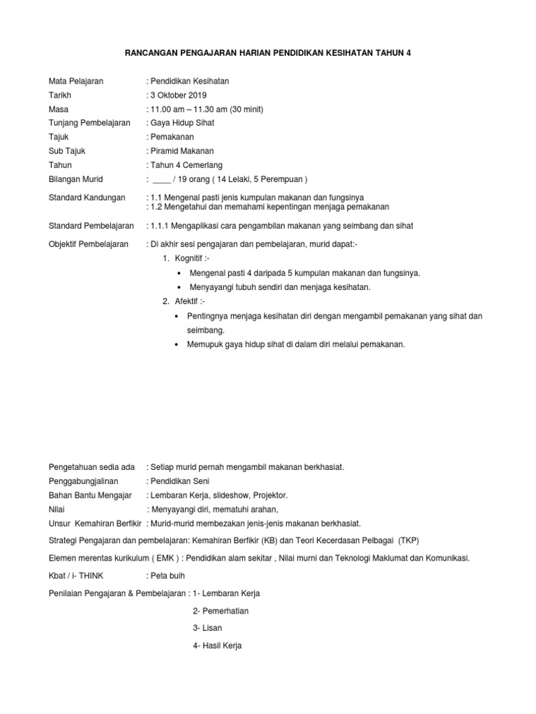 Rancangan Pengajaran Harian Pendidikan Kesihatan